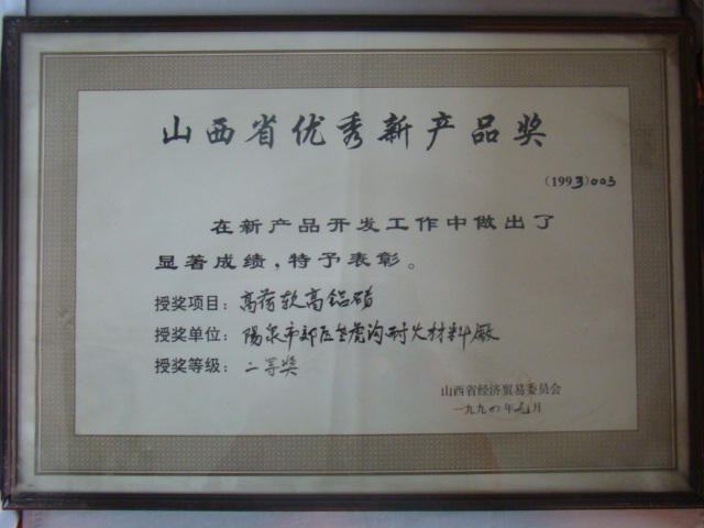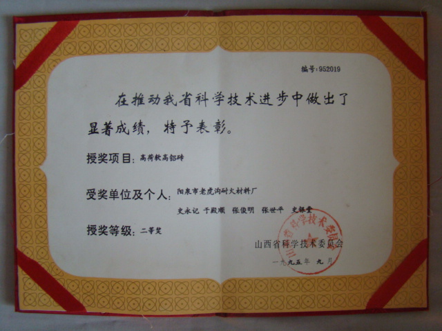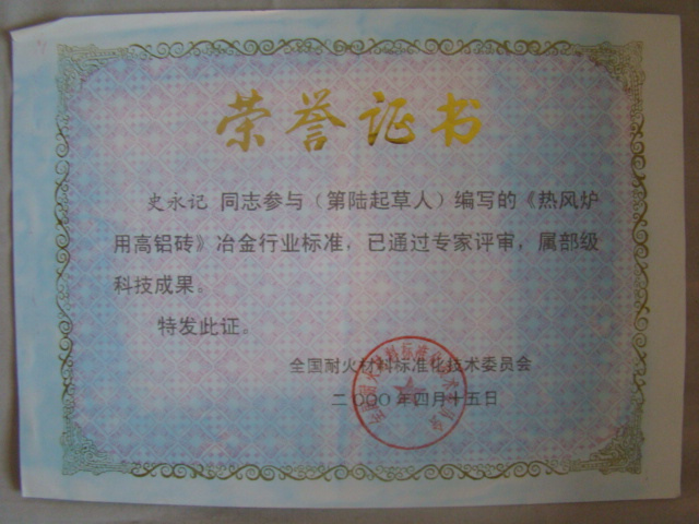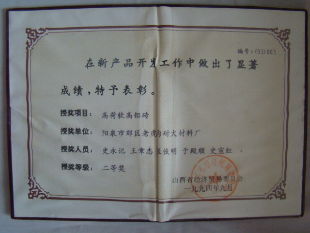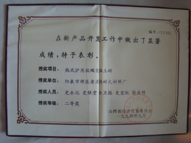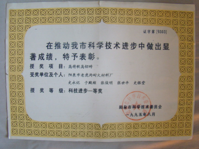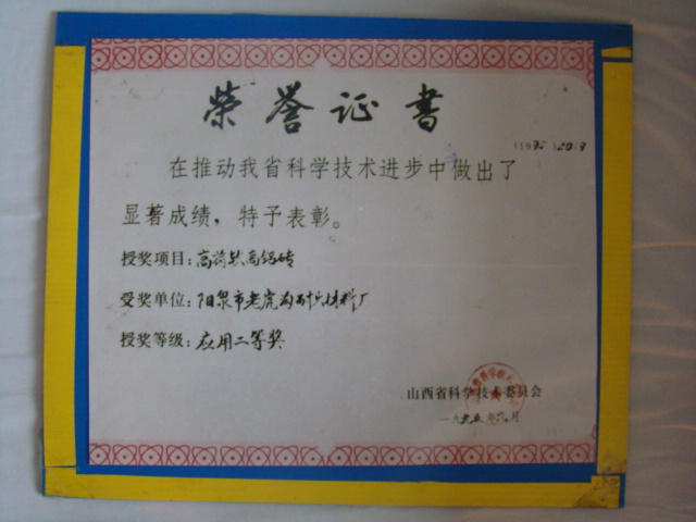 熱風(fēng)爐用低蠕變高鋁磚、高荷軟高鋁磚獲省科技進(jìn)步二等獎(jiǎng),微膨脹高鋁磚列入火炬計(jì)劃項(xiàng)目,炭素焙燒爐用特種高鋁磚已批準(zhǔn)國(guó)家專利